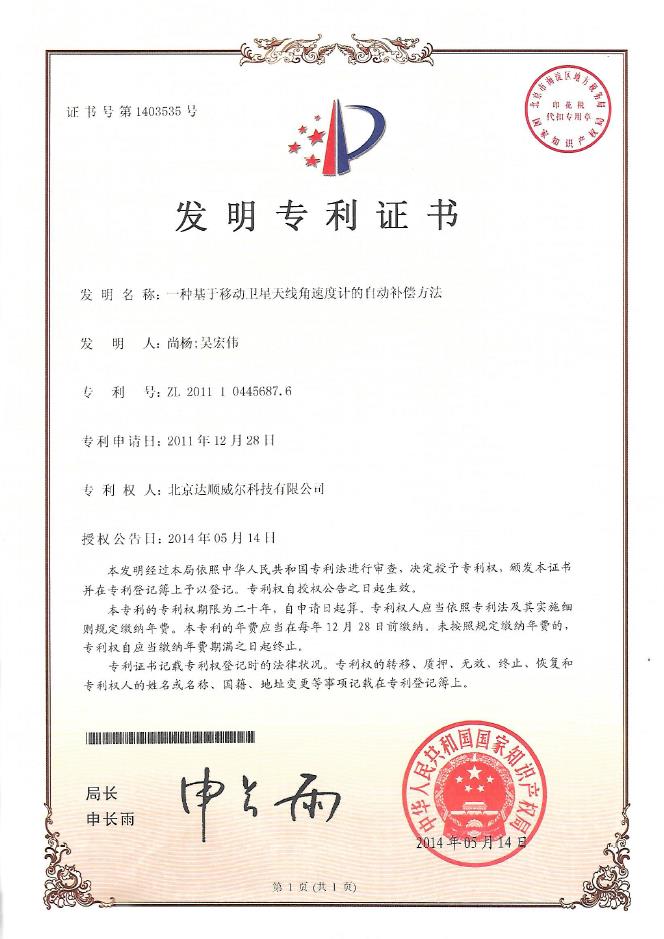 发明专利证书1403535:一种基于移动卫星天线角速度计的自动补偿方法